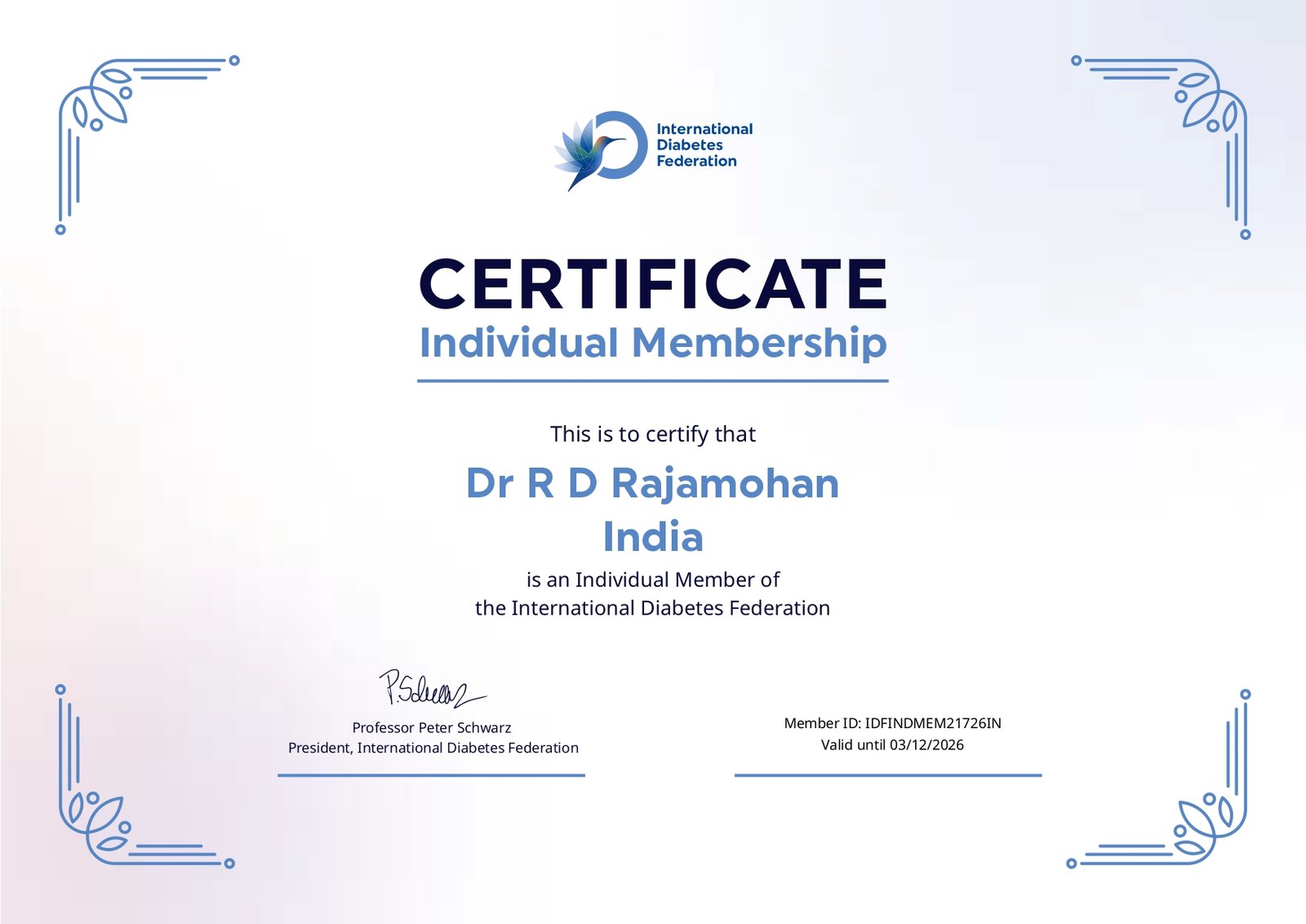 Dr. R. D. Rajamohan has been recognized as a Professional Member of the American Diabetes Association (ADA) since March 21, 2019.